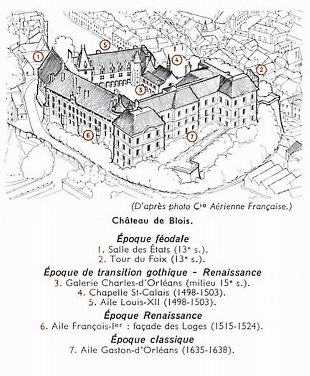 Le château de Blois affecte la forme d'un quadrilatère irrégulier, auquel chaque époque a apporté sa marque. La façade d'entrée, située à l'est, a été construite sous Louis XII, la salle des Etats au XIIIème siècle, l'aile Gaston d'Orléans au XVIIème siècle, le célèbre escalier de l'aile François Ier entre 1515 et 1519. Le décor intérieur du château, supprimé au XVIIIème siècle lors de la transformation de l'édifice en caserne, a été restitué au XIXème siècle. Ainsi le château de Blois donne-t-il une exceptionnelle leçon d'architecture.