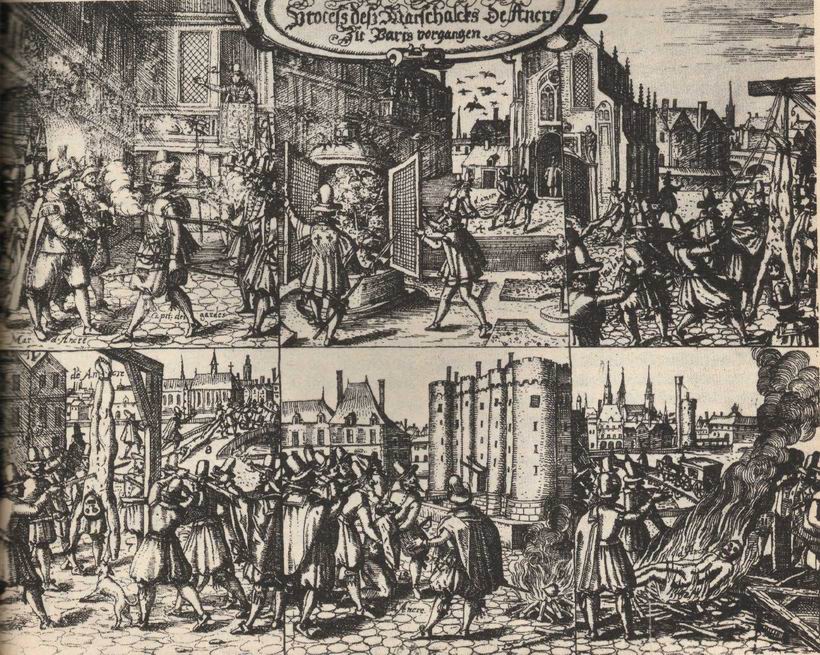 ![]() Arrestation de la maréchale d'Ancre. Accusée implicitement de sorcellerie, condamnée à mort et à la confiscation de ses immenses biens, elle mourut courageusement le 8 juillet 1617. |