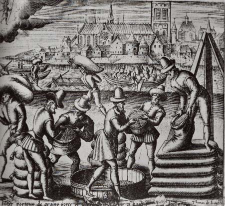 Les jurés et porteurs de grains en place de Grève - Gravure de Thomas de Leu, B.N.